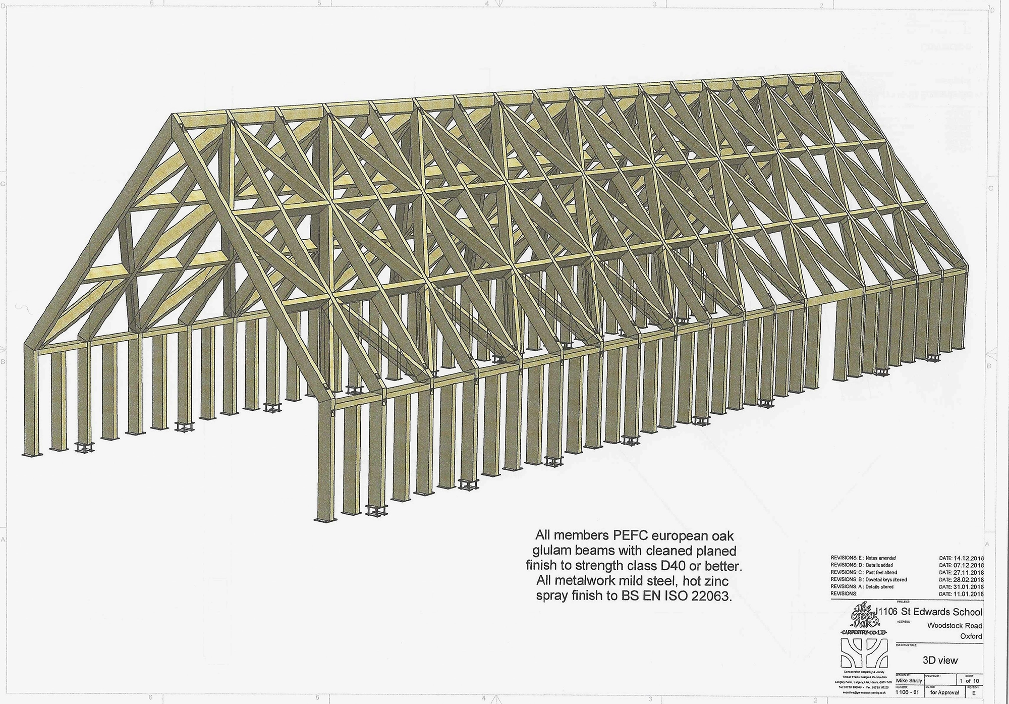 A further complication was that oak glulam does not yet have enough market share to justify the cost of extensive structural testing and grading, therefore the manufacturers were only able to offer a cautious D30 grade. Nigel was willing to take a view, and prepare his calculations based upon a more realistic D40 grade.